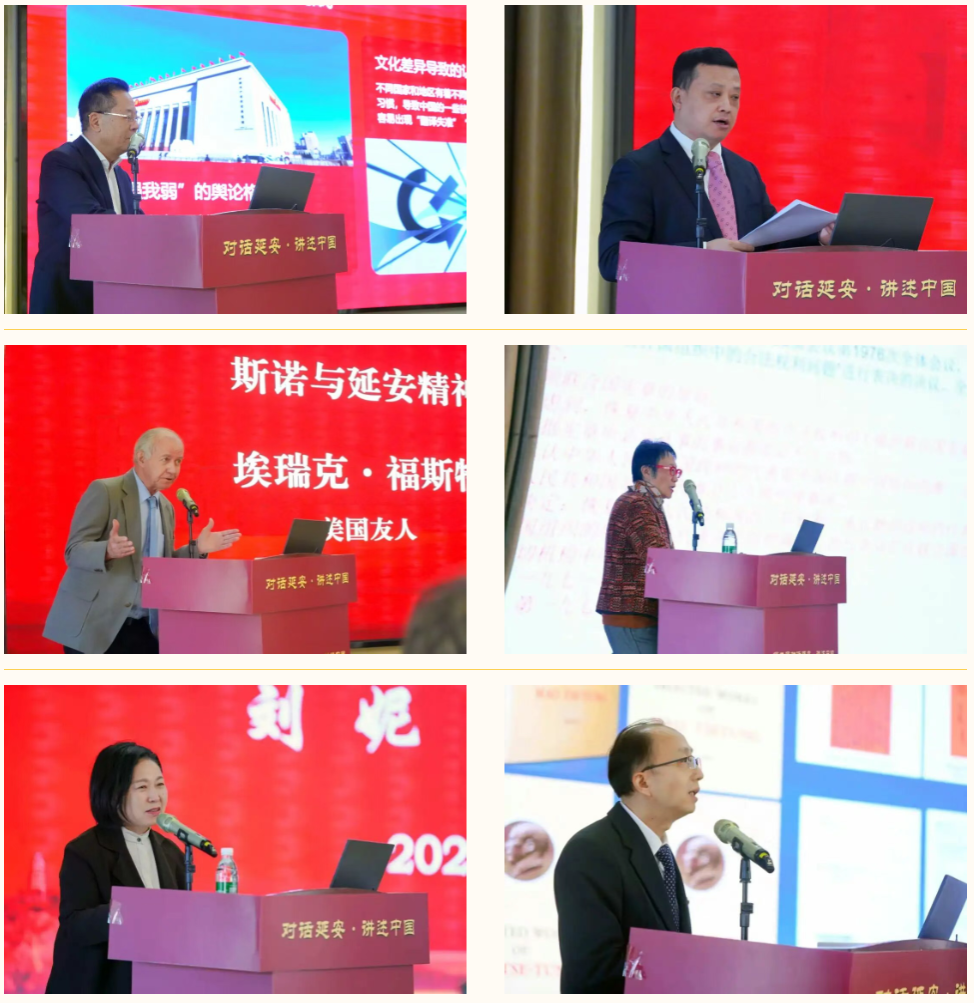 澳门中西创新学院副校长王立非、中国外文局翻译院院长黄玉龙、美国友人Eric Foster、广东外语外贸大学国际合作与可持续发展研究院学术院长张力文、延安革命纪念馆馆长刘妮、西安外国语大学副校长黄立波等分别《从伟大延安精神中汲取奋进力量,推动翻译与国际传播自主学科体系创新》《融通红色基因、以跨学科协同构建延安精神国际传播新范式》《斯诺与延安精神》《延安精神的底色在国际舞台上发扬光大》《把延安故事讲给世界听》《毛泽东著作政治话语体系英译中外对比:基于语料库的考察》等议题作了主旨发言。