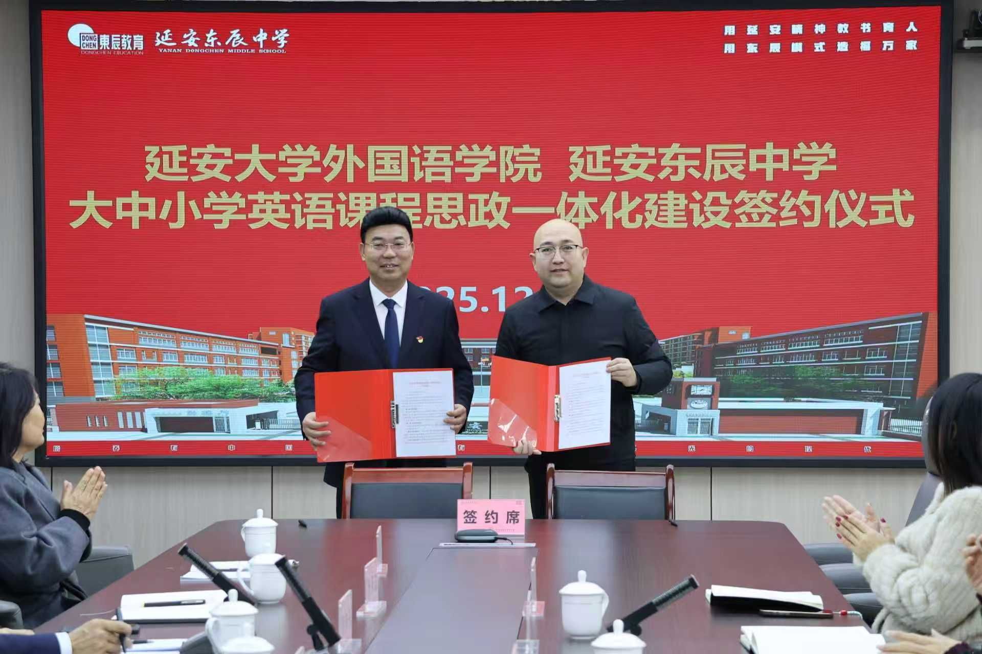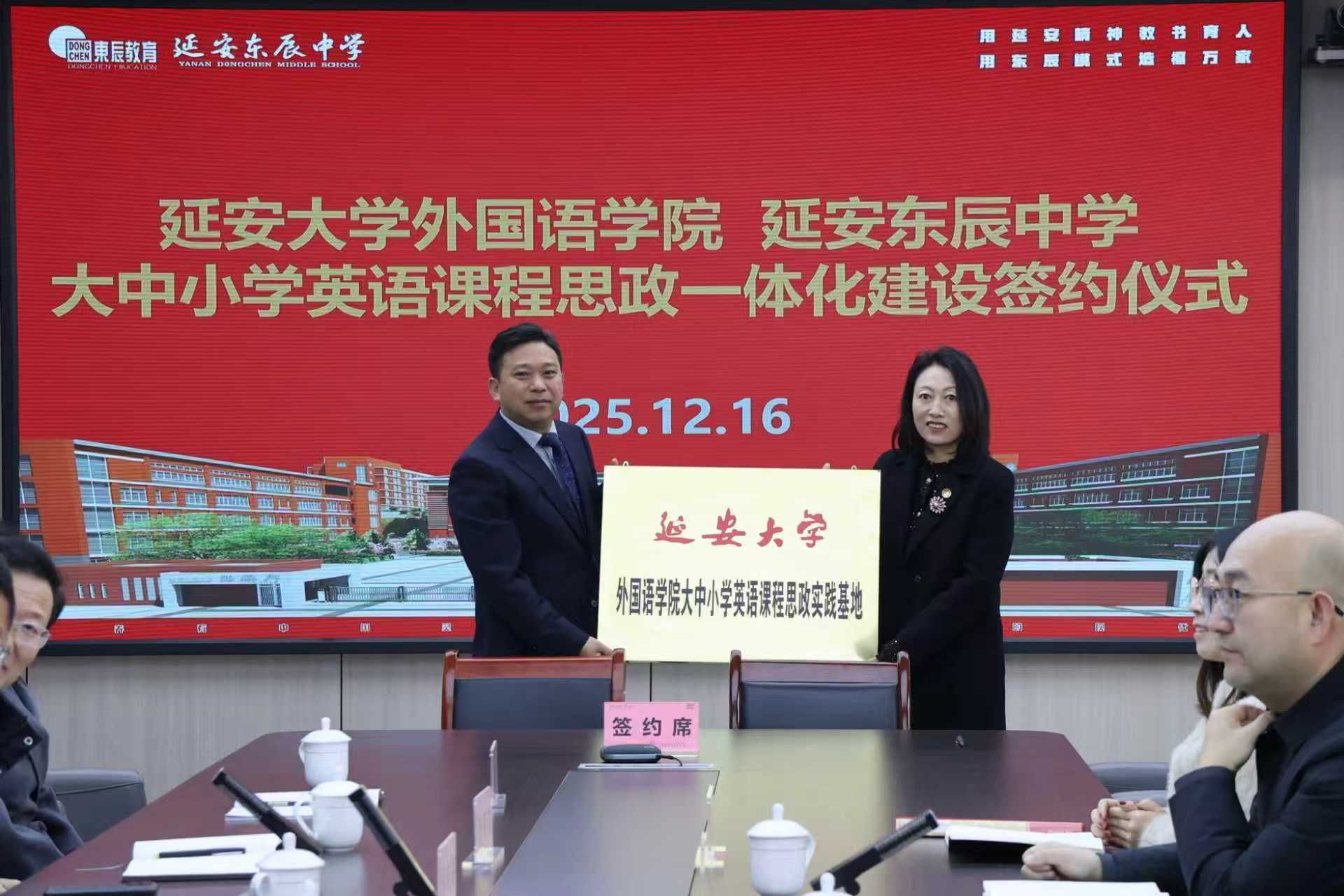 与延安东辰中学举行“大中小学英语课程思政一体化建设”签约和授牌仪式。延安励博教育集团党总支书记韩卿元、延安东辰学校校长李立刚、副校长、高中部校长李国江、副校长王永强、初中部书记张怀志、初中部校长王国聪、附属小学校长王金玲、教研部长郝炳宏,学院党委书记梁艳、副院长常琅、雷琨及两校师生代表出席仪式。仪式由延安东辰学校德育副校长李向东主持。