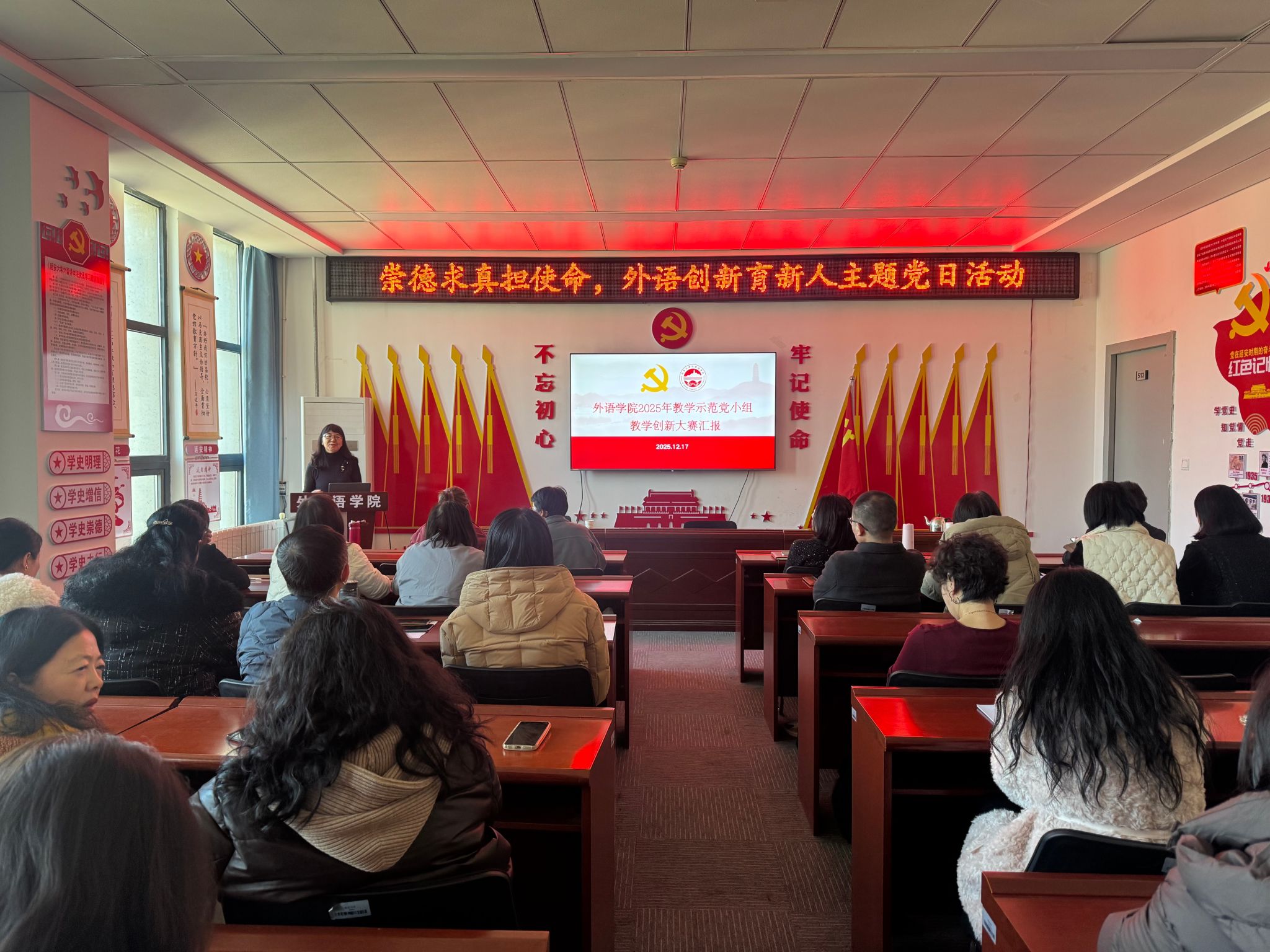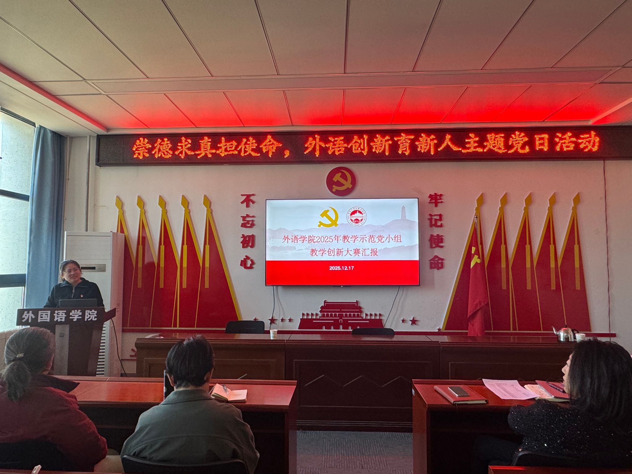 在外语楼513党建活动室举办以“崇德求真担使命,教学创新育新人”的主题党日活动,回顾总结2025年教学创新大赛,动员部署2026年教学创新大赛。活动由教学示范党小组牵头组织,教学示范党小组各位成员、教工党支部全体党员参加了本次活动。活动由教学示范党小组组长惠霞副教授主持,院党委书记梁艳出席并讲话。
