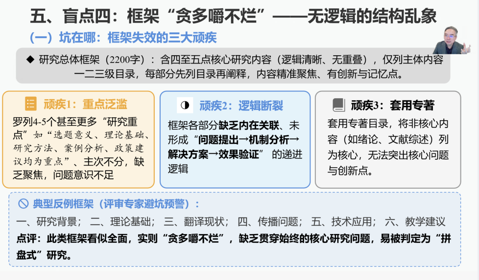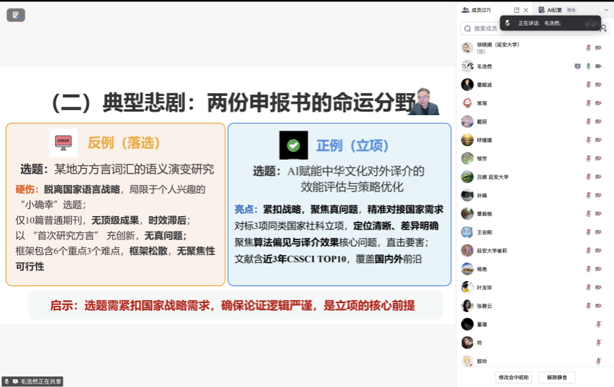 辅导会上,毛浩然教授围绕国家社科项目申报的核心原则与常见问题进行了系统深入的讲解。他强调,选题必须紧扣国家战略,避免“自娱自乐”和“脱离战略”的陷阱,应关注AI赋能、生态文明、文化安全等国家关切领域;研究应坚持问题导向而非兴趣导向,从“我想研究什么”转变为“我准备解决什么关键问题”;学术价值需具体化、量化,与资助额度相匹配;创新点要真实且具体,聚焦1-2个核心创新点,并用数据或实例支撑。在申报书撰写方面,毛教授指出,逻辑结构需严谨,研究思路应像“施工设计图”而非“研究计划”;语言要“说人话”,确保非本领域专家也能看懂;参考文献需精选近三年内、与研究高度相关的权威文献。